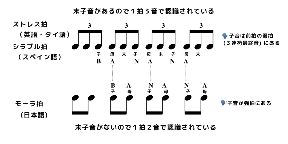 基音節が強拍であることに対し 頭子音 及び 末子音 は弱拍に対応します。