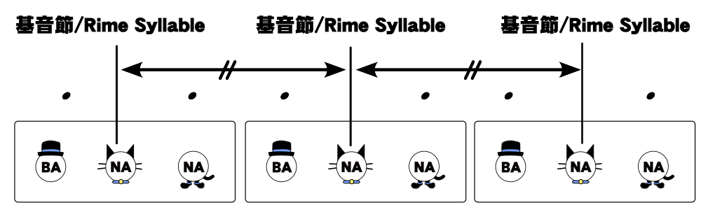 頭子音 及び 末子音 は、等間隔に並んでいる基音節と基音節の間に分散されます。頭音節と末音節の数が増えても基音節の間隔は変わりません。