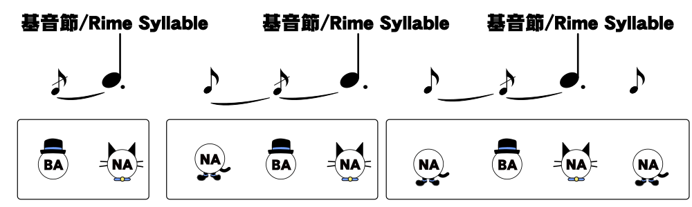 シラブル音節では、頭子音が音節核と独立しており、かつ音節核に音節基が置かれている為、頭子音がなくなっても音節核の位置は変わりません。 しかしモーラ音節では、頭子音が音節基に含まれている為、頭子音がなくなると音節基がその分拡張します。 これがモーラ拍リズムの3番目の特徴です。